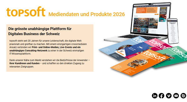 Mit klarem Fokus auf Digital Business erreicht das topsoft Fachmagazin vierteljährlich über 12'000 persönlich adressierte Abonnenten. Fachartikel, Hintergrundberichte, Marktübersichten, Fallstudien und Praxistipps bieten den Lesern einen echten Mehrwert in der Planung und Nutzung digitaler Lösungen und Konzepte. Begleitet wird die Printausgabe rund ums Jahr mit aktuellen Online-Inhalten. Wir multiplizieren Ihre crossmedialen Inhalte auch mit Social-Media-Kampagnen auf LinkedIn und Facebook und sorgen so für noch mehr Reichweite.