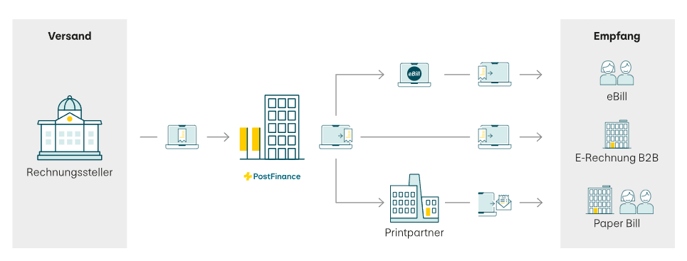 PostFinance beschreibt das so: «Sie senden uns Ihre Rechnungsdaten direkt aus Ihrer Software oder über unser eInvoicing-Portal. Wir bereiten die Daten strukturiert auf und übermitteln die Rechnung als E-Rechnung B2B oder eBill an die Empfängerin. Wie Sie als Unternehmen Ihre Daten am besten einliefern, hängt davon ab, ob Sie bereits eine Software mit Schnittstelle zu PostFinance nutzen oder nicht.»