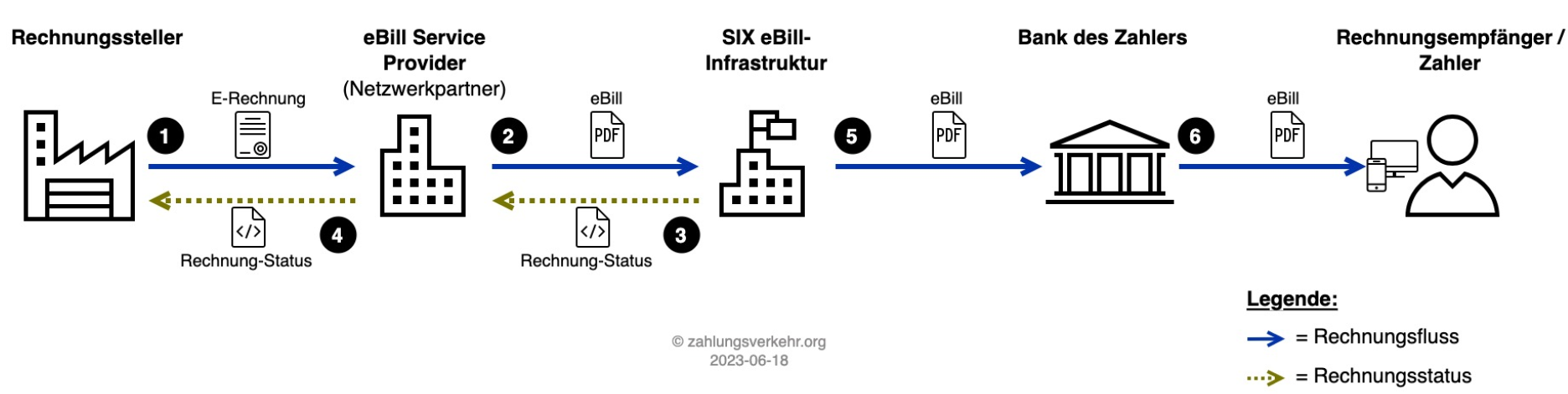 - Rechnung-Status vom Service Provider: Der eBill Service Provider meldet den positiven Rechnung-Status von SIX dem Rechnungssteller zurück.