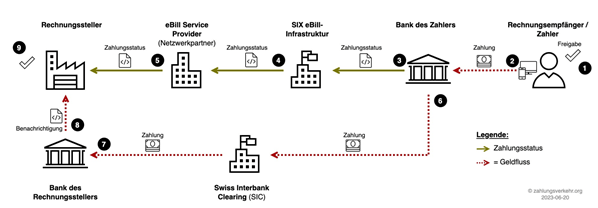 - Weitergabe des Zahlungsstatus an SIX: Die Bank des Zahlers informiert die SIX, dass die eBill zur Zahlung freigegeben wurde.