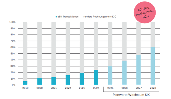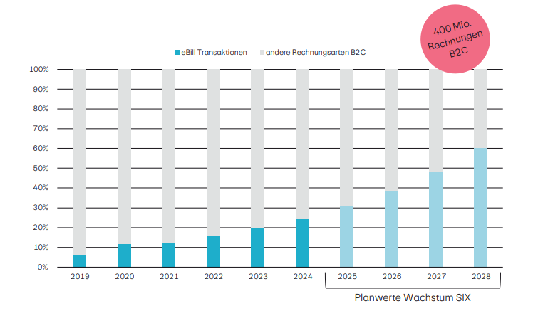 Mit mehr als 3,5 Millionen aktiven Nutzenden (Stand Januar 2025 gem. www.ebill.ch) hat sich eBill als führender Standard für digitale Rechnungen in der Schweiz etabliert. Ziel des Finanzplatzes Schweiz ist es, 60 bis 80 % der Business-to-Consumer-Rechnungen bis 2028 end-to-end digital abzuwickeln und auf eBill zu verlagern.