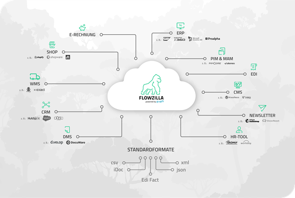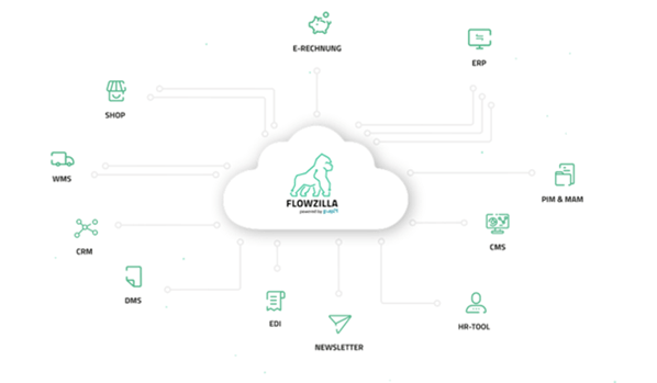FLOWZILLA ist eine cloudbasierte iPaaS-Lösung (Integration Platform as a Service), die als digitale Datendrehscheibe fungiert. Sie verbindet ERP-, CRM-, WMS-, DMS- und PIM-Systeme über zahlreiche Out-ofthe-Box-Konnektoren, orchestriert Datenflüsse in Echtzeit und automatisiert selbst komplexeste Unternehmensprozesse.