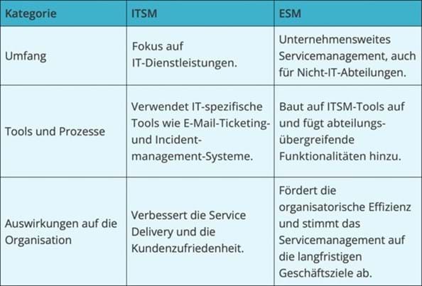 Es sollte jetzt hoffentlich klar sein, dass ESM im Wesentlichen eine Möglichkeit ist, die Magie des ITSM in Flaschen zu füllen und auf andere Bereiche Ihrer Organisation auszudehnen. Nachfolgend eine aussagekräftige Tabelle zur Veranschaulichung des Sachverhalts: