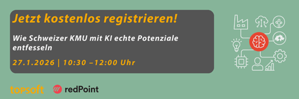 Theorie ist gut, Praxis ist besser. Erfahren Sie in unserem Digital Event am 27. Januar 2026 zusammen mit redPoint "Wie Schweizer KMU mit KI echte Potenziale entfesseln" und wie Sie KI sinnvoll und verantwortungsvoll einsetzen können – praxisnah, verständlich und ohne leere Buzzwords.