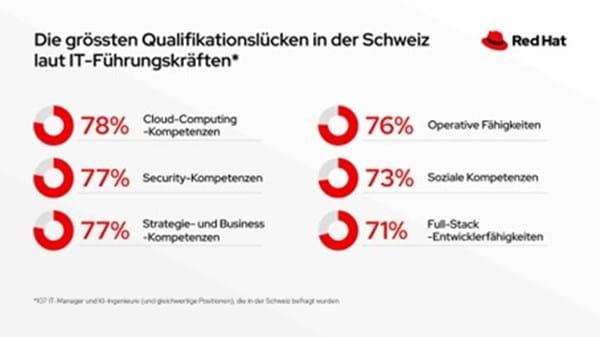 Die Gewinnung und Bindung von Talenten bleibt eine Herausforderung. In der Schweiz identifizieren die Befragten drei kritische Qualifikationslücken an der Spitze: Cloud-Computing-Fähigkeiten (78 %) führen die Liste an, während Security-Fähigkeiten (77 %) und strategische/geschäftliche Fähigkeiten (77 %) nahezu gleichauf als dringendste Bedarfe genannt werden.