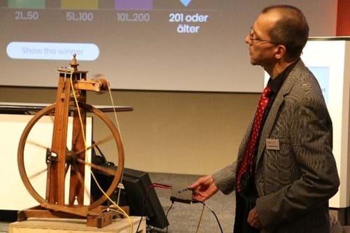 Wie sich mit wenig Technologie sogar ein 200jähriges Spinnrad zur IoT-Maschine umrüsten und nutzen lässt, zeigte Contest-Moderator Dr. Marcel Siegenthaler beim Software Contest.