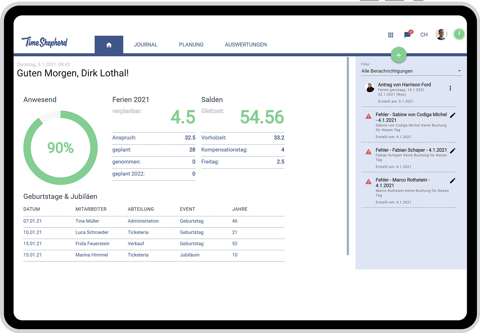TimeShepherd trägt dem voll und ganz Rechnung und wartet mit innovativster Technologie, optimaler Anwenderfreundlichkeit und hochansprechender Optik auf. Dazu gehört selbstverständlich auch das erstklassige Cockpit der Software, also die Schaltzentrale, deren intuitive Bedienung durchwegs überzeugt. Mit ihrer Komplettlösung schafft die Lothal Datentechnik rundum ideale Voraussetzungen für einen reibungslosen Ablauf in der Arbeitszeitbewirtschaftung.